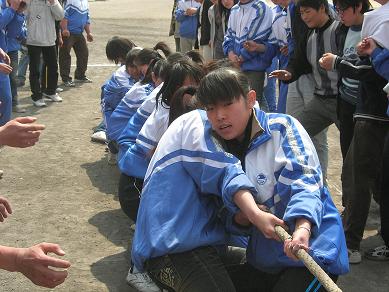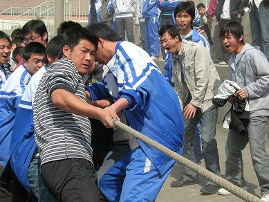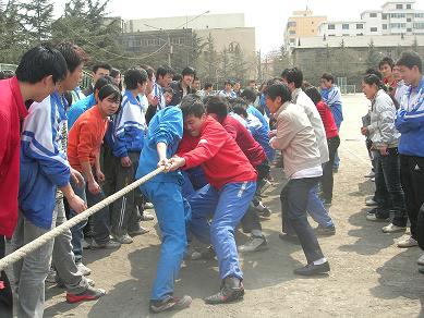 比赛中,各班参赛的同学表现出了顽强的意志和拼搏精神,在啦啦队同学震耳的“加油”呐喊声中,比赛进行得异常激烈,双方队员紧紧抓牢手中的绳子,齐心协力往后拉。加油声、叹息声、欢笑声此起彼伏,在这紧张时刻,队员们咬紧牙关,使尽全力,奋勇拼搏。有的队员手和脸都拉得通红,有的身体斜斜就快躺到地上去……每一个班级的参赛队都全力以赴,赛出了顽强的精神、团结的风尚。