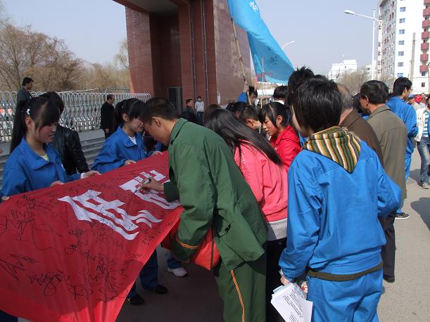 上午9时,40名余名志愿者举着系旗,统一着装,排着整齐有序的队伍来到了西固公园门口。活动中,同学们分工明确,一部分志愿者通过散发宣传单的形式,讲解使用一次性塑料袋对环境的危害及保护环境的重要性,呼吁广大市民自觉学习低碳生活知识,形成低碳生活共识,引导广大居民争做低碳生活的先行者,养成一种自然而然地去节约身边的各种资源的生活习惯,从生活的点点滴滴做起,做到出行尽可能选择公共交通工具或自行车,使用节能灯泡,合理使用电视、冰箱、电脑等电器。另一部分志愿者组织开展“低碳生活,从我做起”签名活动。闻讯赶来的许多市民都积极参加到活动中来,争先恐后地在横幅上签下自己的名字。广大市民在踊跃签名的同时与队员们交流了他们在日常生活中的低碳环保行为,并对此次活动给予了充分肯定,希望同学们能把低碳环保宣传工作长期做下去,让更多的人了解低碳生活,参与到环境保护中来。