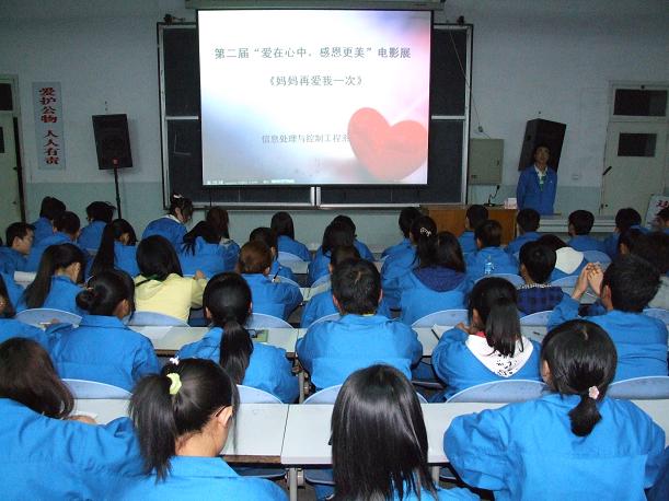此次教育活动主要以观看诠释母子深情的经典影片——《妈妈再爱我一次》的方式开展。影片《妈妈,再爱我一次》讲述了秋霞与林国荣不平凡的爱情经历,以及她与那被强行领走儿子志强之间的深深母子情。该影片把母亲对孩子无私、伟大的爱和孩子的感恩之心表现得淋漓尽致。当看到母亲被迫与相依为命的儿子分离、儿子因探母淋雨高烧不退昏迷不醒、母亲心情激动失足跌下楼梯变成了疯子等情节时,许多同学被那伟大真挚的母爱深深的打动,留下了感动的泪水。影片结束后,同学们纷纷表示看完这部电影感受很深,突然认识到每位母亲都是一样的,一切为了孩子,为了孩子一切,在以后的生活中,将努力学习,懂得感恩,学会回报,学会用心灵去关怀,努力做一个生活中的强者,生命中的感恩使者。