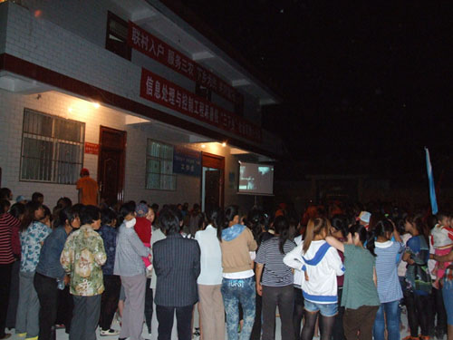在榆树村的日子里,为了丰富村民们的精神生活,积极营造“三下乡”之“文化下乡”良好社会实践氛围,充分利用晚上空余时间,小分队自备器材,在村委会小广场前,每晚都安排有影片展播,8:00准时开播,小分队在来榆树村之前就做了充分准备,都是比较大众化的,贴近生活,深受农村人喜欢的题材内容,有赵本山农村系列小品、电影《妈妈再爱我一次》、《太行山上》,还有小朋友喜欢的《功夫熊猫》等等。每天晚上,这个虽不宽敞的乡村小院却都挤满了观看的村民,小院上空时常被欢声笑语萦绕,久久回荡。