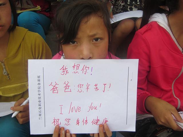 同时利用支教课间休息时间对留守儿童进行感恩教育和心理辅导,告诉他们要理解父母外出打工的辛苦,都为了供他们上学,为他们营造更好的生活环境,鼓励他们好好学习,将来报答父母的养育之恩。有的队员拿出自己的手机,让孩子们和父母交流,孩子们都非常激动,告诉父母自己都很好,让他们不要担心。队员们还组织孩子们把想对父母说的话写到纸上,表达对父母的真情问候,孩子们都非常认真,深情的写下了自己的句句祝福。虽然有些孩子字写得歪歪斜斜,有的孩子话语中还有错别字,有的孩子还将大哥哥、大姐姐教的英语运用到其中,虽不都通顺,但每一个孩子的心都是真诚的,也深深地感染着我们每一个师生。