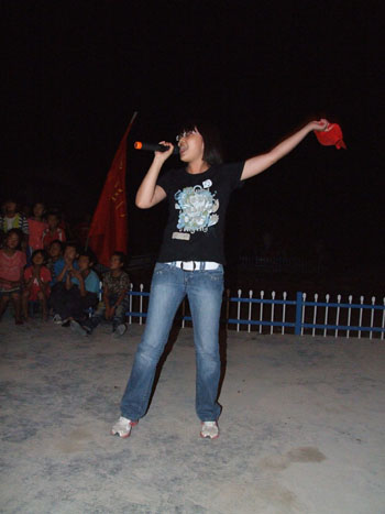 经过精心准备和与村委会的积极沟通,由“信息先锋,爱心服务”小分队和榆树村村委会联合举办的主题晚会如期召开,晚会得到了榆树村舞蹈队和小学的积极参与,由榆树村党支部副书记兼工作点办公室主任刘旺平同志致开幕词,在小分队队员们的一曲《最炫民族风》的开场舞中拉开了帷幕,随后榆树村舞蹈队的阿姨们带来的《荷塘月色》、《一曲相送》及榆树小学舞蹈队的《天天向上》、《大家一起来跳舞》等节目迎来了全场的阵阵掌声;小分队也不甘示弱,手语舞蹈《感恩的心》、合唱《水手》、《不再犹豫》等节目更是将晚会推向一个又一个高潮;刘旺平副书记、带队老师与指导老师也分别献唱了《北国之春》、《父亲》、《自由飞翔》,同样为晚会增彩不少。最后,晚会在队员与观众们共同合唱《相亲相爱》的旋律中圆满闭幕。