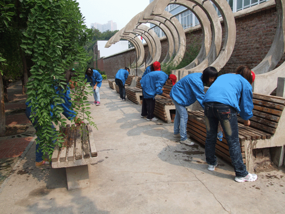 早上10点,41名志愿者统一穿工装,自带清洁工具对22街区休闲区的座椅、活动器材、路灯立柱、路面垃圾、树下的落叶以及垃圾箱、文艺宣传栏上的尘土、污渍进行了全面清理、擦洗。活动中志愿者们自行分组、明确分工、相互配合、没有放过任何一个卫生死角,劳动场面十分热烈。经过1个小时的辛勤劳动,街区的面貌有了很大改观,地上的落叶、路面上的烟头、碎纸屑、瓜果皮等被清扫的干干净净;垃圾箱、文艺宣传栏在阳光的映衬下显得光泽明亮。