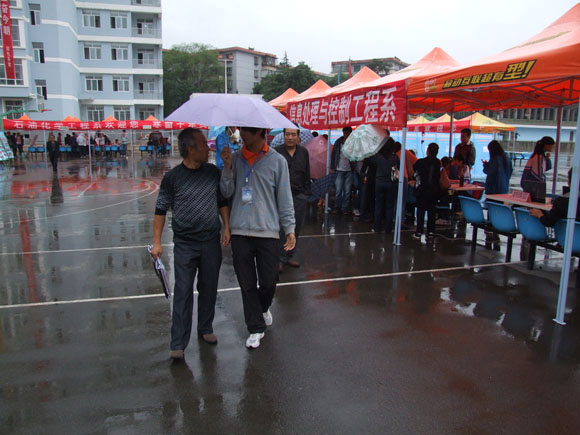 “天有不测风云”,为了确保迎新工作的顺利开展,迎新工作准备阶段,志愿者专门组织员工查阅了迎新期间的天气状况,得知9月9日、10日下雨的可能性比较大,于是要求每一位志愿者准备一把雨伞以备不时只需,并成立“爱心伞”服务小组。果然,9月10日上午下起了中雨,“爱心伞”小组合理安排、分工明确,保障了迎新工作的顺利进行,得到了新生及家长的一致好评。