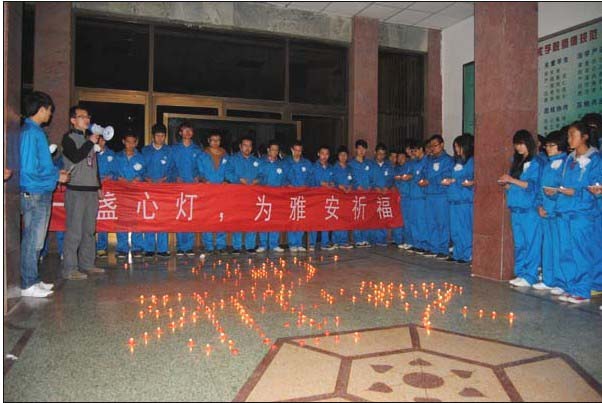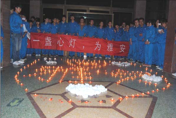晚上8:00,在团学干部的倡议号召下,全体员工佩戴白花,手托红烛,拉起“点一盏明灯,为雅安祈福”的主题横幅齐聚主教楼大厅,分别以不同的方式表达着为逝者默哀、为伤者祈福的真挚情感。活动开始后,系团总支书记首先向在场的员工介绍了雅安地震受灾的最新情况,倡导同学们一起为雅安灾区人民祈福,积极发挥“一方有难,八方支援”的民族优良传统,与灾区人民携手共渡难关,相信只要我们共同努力,“救”会更有希望,并与全体同学共同为雅安地震中遇难的同胞们集体默哀三分钟。随后,员工会主席米文斌同学带领同学们共同喊出了“雅安加油、雅安挺住,我们的心永远跟雅安人民连在一起……”的心声祝福,表达着对雅安同胞的牵挂和良好祝愿。