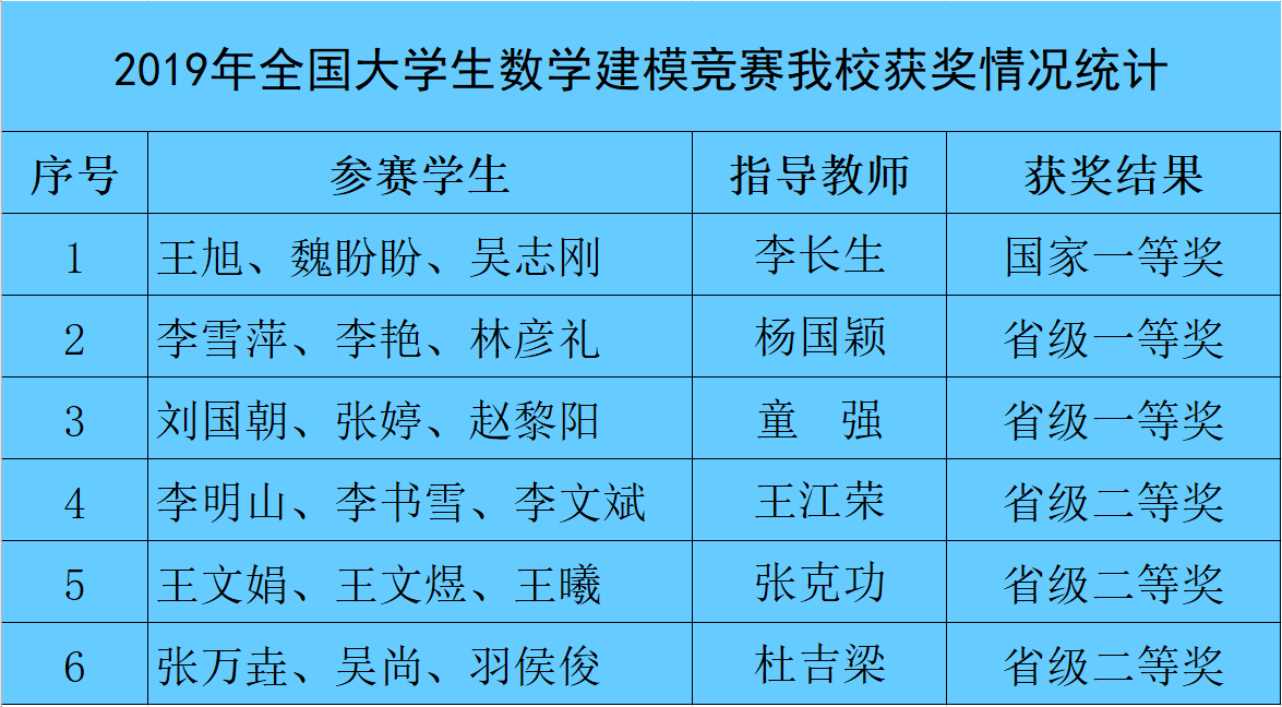 近日,由教育部高等教育司和中国工业与应用数学学会共同主办的2019年“高教社杯”全国老员工数学建模竞赛获奖结果公布。2019年共有来自全国及美国和马来西亚的1490所院校/校区、42992支队伍队(本科39293队、专科3699队)、近13万人报名参赛。由信息处理与控制工程公司牵头组建的公司代表队参加了该项竞赛,经过激烈角逐,最终公司代表队斩获国家一等奖1项(甘肃省专科唯一)、省赛一等奖2项,二等奖3项的历史好成绩。据悉,自2010年至今,公司累计获国家一等奖2项,国家二等奖10项,省级一等奖8项,省级二等奖14项,成绩在省内专科院校中首屈一指。