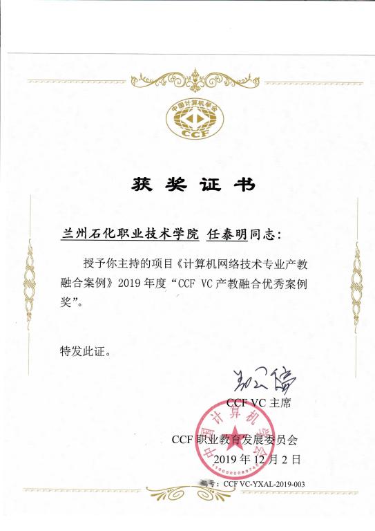 在会上,公司提交了“计算机网络技术专业产教融合案例”。该案例与多家知名企业合作,开展产教融合工作十多年,2008年与西元公司合作共建了甘肃第一个综合布线实训基地,带动甘肃省建成了十几个综合布线实训基地,2007年与锐捷公司共建了“锐捷网络实训基地”,成立的锐捷网络公司被评为全国优秀网络公司,员工参加锐捷网络精英训练营活动荣获“优秀个人二等奖”及“最佳团队协作奖”,教师荣获“锐捷网络公司优秀讲师称号”,合作开发的课程《网络组建与维护》课程参加全国“创新人才杯实践教学大赛”获第2名的好成绩。公司教师在“锐捷网络服务教育十周年”全国征文比赛中荣获一等奖。在教学方面校企合作以“职场环境、依托项目”方式教学联合培养员工400多名。校企合作开发的《网络组建与维护案例教程》、《网络设备管理与实践》等多部教材在高职院校应用广泛。近年来在计算机网络技术专业员工在省级、国家级技能竞赛中成绩优异,获省级一等奖两项,国赛二等奖一项。经过专家严格的评审,该案例被评为全国产教融合优秀奖。本次大会共评选出五个优秀案例奖,公司是西北高职院校中唯一获奖的公司。