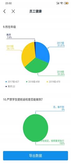 三、精准掌握疫情数据。习近平总书记在北京市调研指导新型冠状病毒肺炎疫情防控工作时强调,要运用大数据等手段,加强疫情溯源和监测。信控公司自疫情肆虐以来,22名班主任、辅导员牺牲休息时间,党员干部带头,积极响应省教育厅、公司对疫情防控数据的具体要求。以教职工假期信息汇总表、疫情防控期间教职工信息报表为基础,建立了公司教职工疫情防控数据动态管理台账。自1月26日起着手建立《信控学工》钉钉群,系统设置纵向5层架构,领导小组负总责、2017/2018/2019三个年级群分别由辅导员负责、各班级群班主任具体负责;横向架构员工党支部群、班主任群、班长群、员工干部群等交叉管理。通过网络平台对全院25个班级、1377名师生,进行精准数据采集和统计。【员工健康】全面掌握每日员工健康情况,引导员工进行学习活动;【钉钉运动】进行适当的身体锻炼,提高免疫力。同时完成公司【完美校园】疫情数据填报任务。班主任为班级第一责任人,落实不按时填报原因,真正做到数据精准、有据可查、责任到人、科学防控。