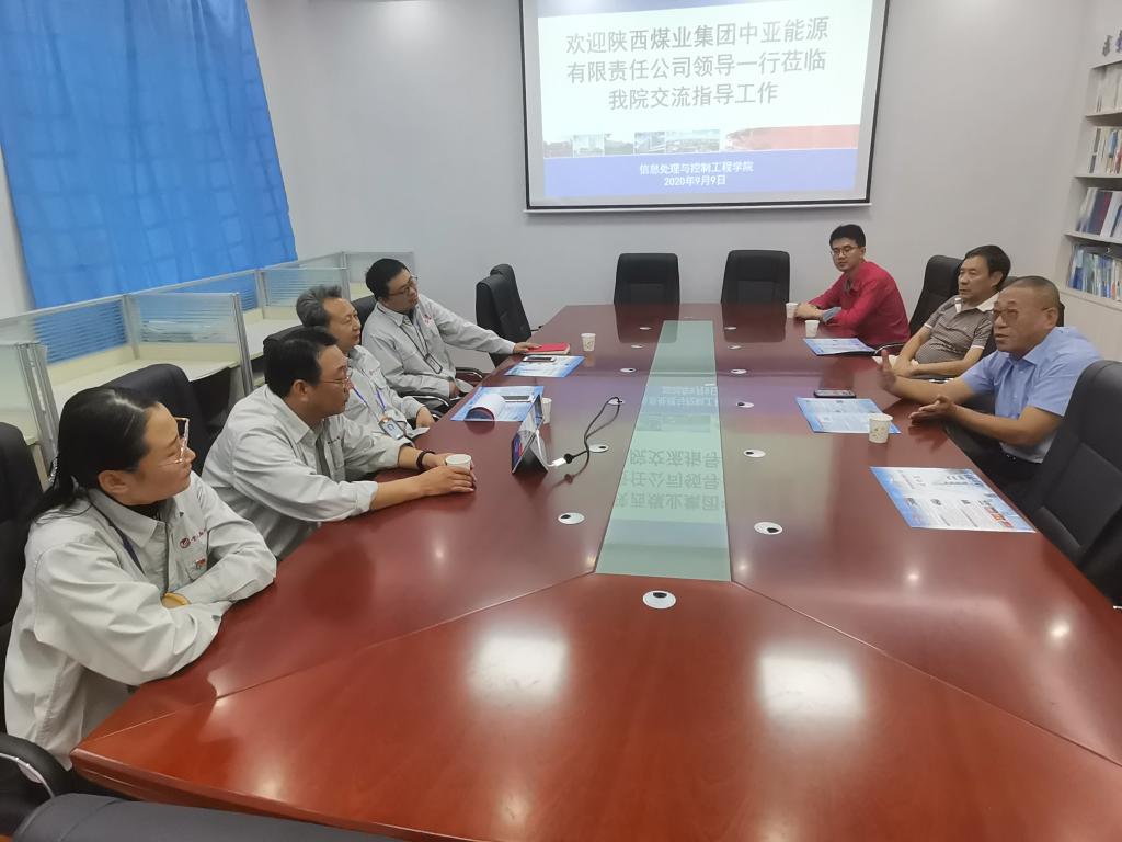 近日,公司党委副书记黄义仿,信息与教育中心主任陪同陕煤集团中亚能源有限责任公司董事长党向红,总经济师兼人力企管部部长吴胜军一行2人到信息处理与控制工程公司教师研修室开展了校企合作交流洽谈。,信息处理与控制工程公司领导参加了座谈会