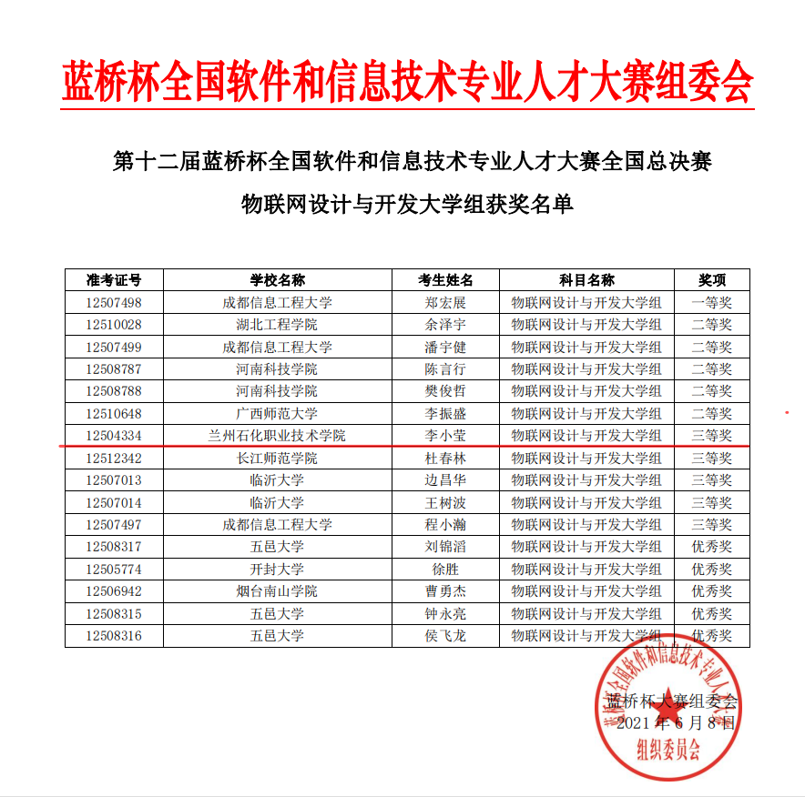 6月8日,第十二届蓝桥杯全国软件和信息技术专业人才大赛全国总决赛成绩落下帷幕,此次个人赛全国总决赛在全国31个省市自治区、318所高校同步开赛,来自北京大学、清华大学等近千所高校的1万余名精英选手参赛,展开了激烈角逐。公司信息处理与控制工程公司两名员工荣获省赛一等奖,取得全国决赛资格。决赛中,物联网设计与开发赛项与本科同台竞技,文晖老师指导的李小莹同学荣获三等奖,田春婷老师指导的赵宁同学荣获大学C组优秀奖。