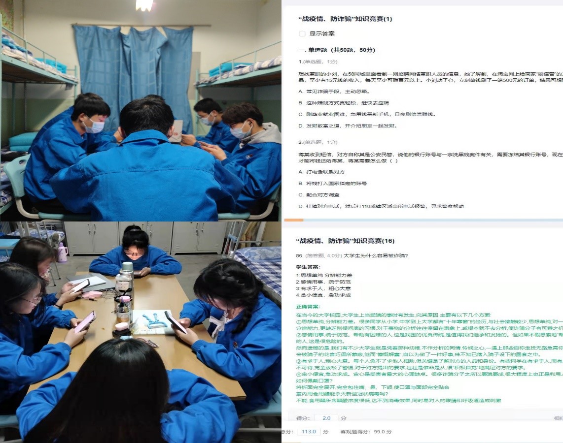 此次竞赛活动,有效宣传了同学们疫情在校期间如何预防网络电信诈骗,提高了对电信网络诈骗的关注和重视。同学们纷纷表示,要树立正确的法治意识和消费观念,维护自身的人身安全、财产安全,用自己实际行动创建文明安全校园。