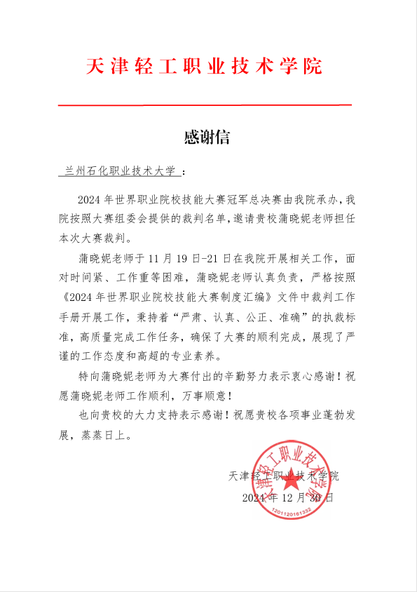 近期,2024年世界职业院校技能大赛冠军总决赛在天津轻工职业技术公司举办,zoty中欧蒲晓妮教授受邀担任大赛裁判。比赛期间,尽管时间紧、任务重,但蒲教授依旧凭借着高超的专业素养,严格按照执裁标准,高效地完成了工作,保障了大赛的顺利完成,获得了各参赛队的一致好评,承办院校特地发来了感谢信以示感谢!