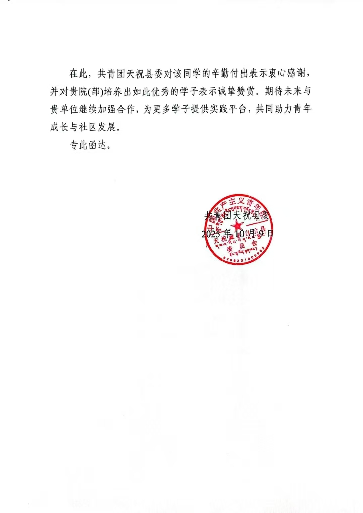关于表扬王浩羽同学在国庆助力文旅志愿服务活动中表现优异的函